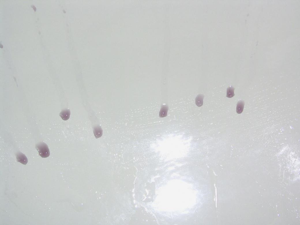 Im Foto deutlich erkennbar, dass es zwischen der linken und der rechten Fläche keinen Unterschied in Bezug auf Hydrophobierung gibt. Alle aufgebrachten Tropfen legen identische Wege zurück.